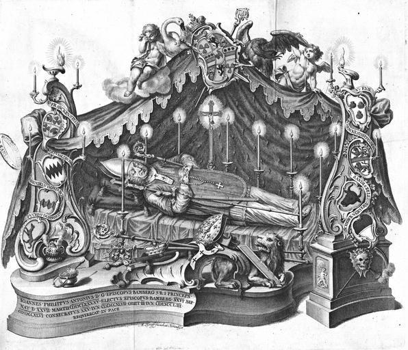 | Keywords: Frankenstein Johann Philipp Sterbebett 2.jpg Johann Philipp von Frankenstein 1695-1753 Fürstbischof von Bamberg auf dem Sterbebett Bonifaz Hillenbrand Gottsförchtiger mithin hochbeglückter ehrenvoller Lebenslauff und darauf erfolgter noch glückseeligerer Tod des Joannis Philippi Antonii Bischoffen zu Bamberg http //www bayerische-landesbibliothek-online de/bamberg-leichenpredigten 1753 M Tyroff 1704-1759 Johann Philipp Anton von und zu Frankenstein PD-old-100 | ||||