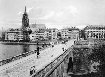 | Keywords: Frankfurt Am Main-Fay-BADAFAMNDN-Heft 26-Nr 301-1911-Blick von der Brueckenmuehle.jpg Follows de Heft 26 Tafel 301 / Titel auf der Tafel Blick von der Brückenmühle / Originalbeschreibung Zu den Denkmälern der alten Reichsstadt die durch Geschichte und Sage verklärt bestimmt sind für ewige Zeiten im Gedächtnis der Menschen fortzuleben gehört die žrote Mainbrücke Aus Mainsandstein errichtet auf massiven Pfeilern mit kräftigen Vorder- und Hinterköpfen die zwischen dem 5 und 7 Bogen eine architektonisch recht wirksame Ausbuchtung erfahren haben überspannt sie in halbkreisförmigen Bogen aus Quaderschichten den ruhig dahinströmenden Flusslauf Ueber das Alter sind wir nur schlecht unterrichtet Die erste urkundliche Erwähnung der alten Brücke geschieht im Jahre 1222 doch ist mit Sicherheit anzunehmen dass die Erbauung einer Holzbrücke in weit frühere Zeit hinaufreicht Mau kann sich kaum vorstellen dass die ansehnliche Niederlassung um den žSaalhoeff das alte Palatium Ludwigs des Frommen nicht schon sehr bald mit den ausgedehnten Wohnsitzen der Ministerialen in der Sachsenhäuser Gemarkung in direkter Verbindung gestanden hat Allein die Unsolidität des Materials und die rohe Naturgewalt worunter die Menschheit des Mittelalters in ganz anderer Weise zu leiden hatte als wir in unseren Tagen zwangen zu dem kostspieligen Ersatzbau in Stein Doch brachten Mangel an Mittel wie auch die Schwierigkeit geeignete Arbeitskräfte zu finden das monumentale Werk nur langsam voran Man fundierte die Pfeiler unmittelbar mit Hülfe von eichenen Schwellenrosten auf die Flusssohle die nicht etwa wie irrtümlich angenommen wird aus Tonschiefer sondern aus blauem Cyrenenmergel besteht der bei der verstärkten Strömung zwischen den Pfeilern den wachsenden Auskalkungen der Sohle nicht genügenden Widerstand entgegensetzt So wird denn im Laufe des 13 und 14 Jahrhunderts wiederholt von ausgeführten Steinarbeiten an Pfeilern und Schwibbogen berichtet Auch für König Heinrich den Sohn Friedrichs II bildete die Erhaltung der Brücke im Interesse des Reiches einen Gegenstand schwerer Sorge Der aus politischen Gründen vor allem den Städten wohlgesinnte junge Fürst verlieh im Jahre 1235 ein Privilegium zur halben Nutzung der Münze und zum Bezug des zur Reparatur der Brücke nötigen Holzes aus dem Reichswalde Auf das höchste bedroht muss aber die Erhaltung der Brücke um das Jahr 1300 gewesen sein Anders hat es keinen Sinn dass fünfzehn italienische Bischöfe einen Ablass für jene Gläubigen gewähren die zum Bau der vom Hochwasser zerstörten Pfeiler beitrugen Die Brückenbahn bestand zu jener Zeit zum grössten Teil aus Holz und gab dem Bauwerk noch nicht durch die eigene Schwere der gewaltigen Schwibbogen eine Stabilität die allen Unbilden der Witterung bis zum heutigen Tage getrotzt und entgegen den gemachten Einwänden auch für absehbare Zukunft noch trotzen würde Immerhin mag die Brücke im Jahre 1405 wie die Abbildung von dem Schreiber eines Bedebuches zeigt das heutige Aussehen gehabt haben Wenn dennoch aus dem Jahre 1419 berichtet wird dass man an dem letzten Pfeiler gearbeitet habe damit mam fernerhin ždes kostlichen buwes mit holczwercken nit bedarff sondern balken druber leget und druff brückendele so handelt es sich hier um die Beseitigung eines Zustandes den man im Hinblick auf unruhige Zeiten belassen hatte um gegebenen Falles ohne weitere Schwierigkeiten die Verbindung der beiden Flussufer aufzuheben Einen gewissen Schutz gewährte immer noch der über zwei Oeffnungen belassene Brückenbelag aus Bohlen der erst Ende des 16 Jahrhunderts durch Bogen am Sandstein ersetzt wurde Und böse Zeiten zogen für das ehrwürdige Denkmal herauf Im Jahre 1427 sah sich der Rat der freien Reichsstadt genötigt aus Furcht vor den wilden Horden der Hussiten die Bogen der Brücke mit schweren Balken versperren zu lassen Den Einspruch des in seinen Fluss- und Hoheitsrechten sich beschränkt glaubenden Erzbischhofs von Mainz nahm man leicht Etwa 100 Jahre später aber während der Bewegung des Bauernaufstandes der auch in das Maintal hinüber gegriffen hatte pflanzte die ärmere Bevölkerung der Stadt die Fahne der Empörung auf der Brücke auf ohne dass es jedoch zu ernsthafteren Zusammenstössen gekommen war Schlimmer erging es dem Bauwerk im schmalkaldischen Kriege Als das Protestantenheer zur Belagerung der damals in kaiserlichem Besitz sich befindenden Reichsstadt schritt hatte man alle Vorkehrungen zum Schutze des unentbehrlichen Verkehrsweges getroffen Grosse Leinentücher waren auf der Brücke gespannt und die Mühle selbst mit grossen Wollsäcken verstopft um sie während der Zeit der Bedrängnisse in Gang zu halten Der Hauptanschlag zur Zerstörung der Brücke vermittels schweren Geschützes vereitelte der Abschluss des Passauer Vertrages und der damit verbundene Abzug eines Teiles der Belagerungstruppen Kaum weniger ernst war die Lage der Brücke im dreissigjährigen Kriege Auf der Fahrbahn selbst kam es zu heftigem Kampfe und es muss als ein Wunder angesehen werden dass bei dem Geschützfeuer von Ufer zu Ufer wobei 26 Häuser in Asche gelegt wurden die Brücke selbst kaum wesentlichen Schaden erlitt Allein an dem Kruzifix seien wie die Ueberlieferung will noch heute die Spuren von Schwedenkugeln sichtbar Im siebenjährigen Kriege wie im Befreiungskriege hat ein günstiger Stern über der Stadt gewaltet und grössere Verluste ferngehalten Im Sturmjahre 1848 sah die Brücke die letzten kriegerischen Ereignisse die aber Spuren irgendwelcher Art an dem Denkmal nicht hinterlassen haben <br>Wie in Kriegszeiten so stand auch in den Jahren des Friedens die alte Mainbrücke im Mittelpunkt des Interessens der Bewohner Ein gewaltiger Menschenstrom zog jahraus jahrein auf uralten Handelswegen über die Brücke die zur Lebensader des Rhein- und Main-Gaues geworden war Durch besondere Gesetze geschützt bedrohte man einen jeden der auf der Brücke Streit anfing mit dem Abhauen der rechten 
