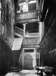 | Keywords: Frankfurt Am Main-Fay-BADAFAMNDN-Heft 01-Nr 003-1896-Hoefchen Tuchgaden Nr 9.jpg Artwork Creator Carl Friedrich Fay Third small interior courtyard of Tuchgaden No 9 The Tuchgadern or the old Gaden camera antiquae are already known under that name in the 14th century The Lane leads from the the Market under the Red House the house with the 3 columns / Red House standing on columns to the Coopers Lane respectively the Cabbage Market where the so called Schöppen Fountain is located The chandlers selling their goods in the vaults where called the Gader-Leute or the Tuchgader that is linen trader In later times the Gaden were changed into Schirnen The alleyway consists of only seven houses The picture of the little courtyard of one of these houses behind Tuchgaden No 9 is a vivid example of the old architecture based mainly on wood The staircase wooden cladding and decoration balustrade etc we look upon appear old-fashioned Die Tuchgadern oder die alten Gaden camera antiquae kommen unter diesem Namen schon im 14 Jahrhundert vor Die Gasse führt von dem Markt unter dem Rothhause dem Hause mit den 3 Säulen Roden huse das uff Suweln stet nach der Bendergassse bezw dem Krautmarkt wo der sogenannte Schöppenbrunnen steht Die Krämer die in den Gaden Gewölben ihre Waaren feil hielten hiessen die Gader-Leute oder die Tuchgader d h Leinwandhändler Später wurden die Gaden in Schirnen verwandelt Das Gässchen weist nur sieben Häuser auf Das Bild von dem Höfchen eines dieser Häuser am Tuchgaden No 9 darf als ein anschauliches Beispiel der alten holzreichen Bauart gelten Wir sehen den freigelegten Stiegenaufgang die Holzbekleidung und Verzierung Geländer etc wie sie uns altväterlich anmuten ca 1896 technique collotype dry plate size cm 20 83 15 3 unknown Private collection Mylius Frankfurt am Main object history credit line Cropped to borders fully manually retouched version Bis an die Ränder beschnittene vollständige manuelle retuschierte Fassung accession number Carl Friedrich Fay Carl Friedrich Mylius Franz Rittweger Fritz Rupp Bilder aus dem alten Frankfurt am Main Nach der Natur Verlag von Carl Friedrich Fay Frankfurt am Main 1896 “1911 PD-old Bilder aus dem alten Frankfurt am Main Nach der Natur Tuchgaden Neues Rotes Haus am Markt Frankfurt am Main 1896 in Frankfurt am Main 1896 |