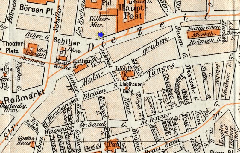 | Keywords: Frankfurt Am Main-Weidenhof-Position-Meyers.jpg en Frankfurt on the Main Position of the Weidenhof as seen on a map of the old town and the inner city de Frankfurt am Main Lage des Weidenhof auf einer Karte der Alt- und Innenstadt Bibliographisches Institut Hrsg Meyers Großes Konversations-Lexikon Ein Nachschlagewerk des allgemeinen Wissens Sechste gänzlich neubearbeitete und vermehrte Auflage Bibliographisches Institut Leipzig und Wien 1902 “10 Bibliographisches Institut 1904 PD-old Weidenhof Maps from Meyers Konversationslexikon |