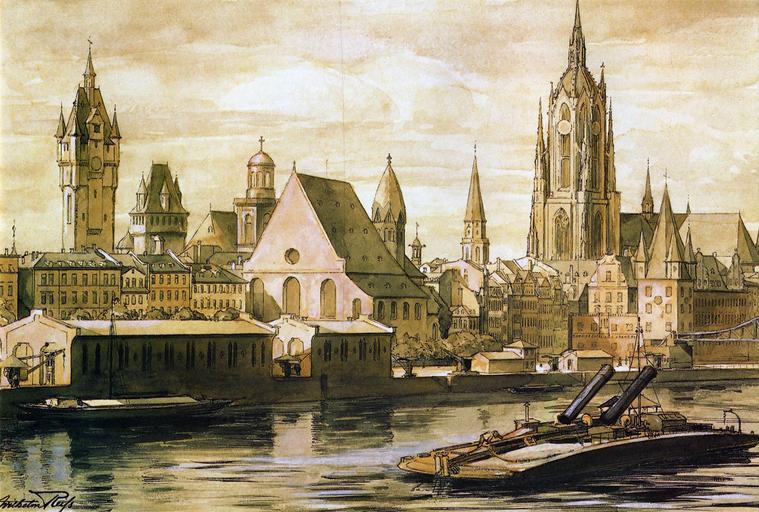 | Keywords: Frankfurt Mainkuh.jpg en Frankfurt on the Main Tugboat žMaakuh coll for žMain Cow of the Mainkette-AG Main Chain Stock Corporation in front of the Mainkai Main Quay on its line between Mainz and Aschaffenburg founded in 1886 in the background from left to right the towers Langer Franz Tall Franz Kleiner Cohn Short Cohn the Paulskirche Saint Paul's Church the Leonhardskirche Saint Leonhard's Church the ridge turret of the Römer the tower of the Alte Nikolaikirche Old Saint Nicholas Church and of the Cathedral followed by the ridge turret atop its crossing and finally the Rententurm Pension Tower de Frankfurt am Main Kettenschleppschiff žMaakuh ugs für žMainkuh der Mainkette-AG vor dem Mainkai auf der 1886 begründeten Linie zwischen Mainz und Aschaffenburg im Hintergrund von links nach rechts die Türme Langer Franz Kleiner Cohn der Paulskirche der Leonhardskirche der Dachreiter des Römers der Turm der Alten Nikolaikirche und des Doms gefolgt von dessen Dachreiter auf der Vierung sowie schließlich der Rententurm Wolfgang Klötzer Wissenschaftlicher Leiter Frankfurt-Archiv Archiv-Verlag Braunschweig Braunschweig 1982 “88 en between 1904 and 1911 probably shortly after 1908 de zwischen 1904 und 1911 wahrscheinlich kurz nach 1908 Wilhelm Reiss PD-Art Main in Frankfurt am Main 1909 in Frankfurt am Main 1886 Frankfurt-Altstadt Chain ships |