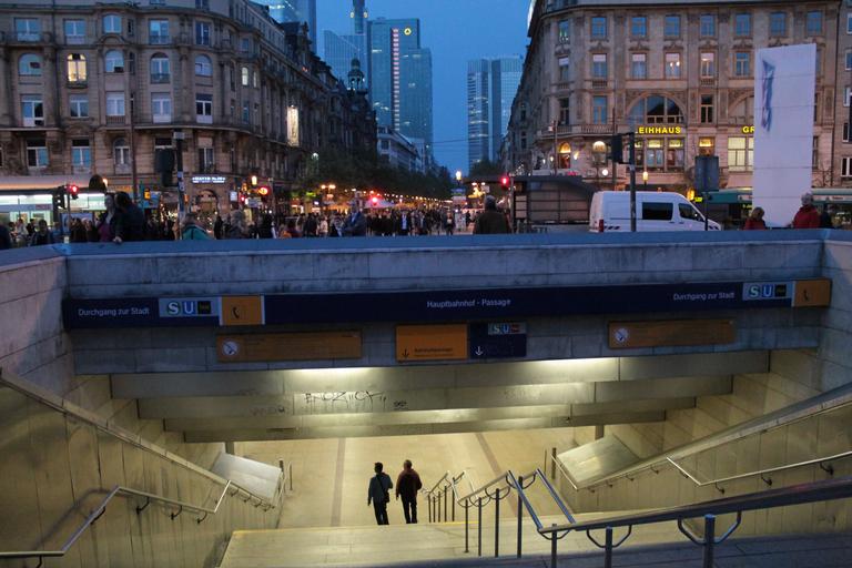 Keywords: frankfurt railway station underpass stairs railway station area central station two personal pedestrian together for two human