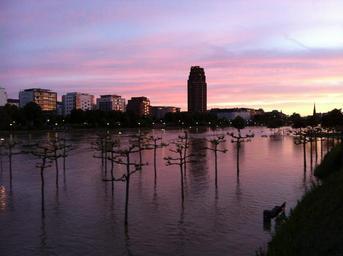 Keywords: frankfurt sunset plane eastern harbour sky clouds architecture high water tower gloomy city building sun crane main river water summer mirroring reflections bridge nature river banks bank water river ship traffic