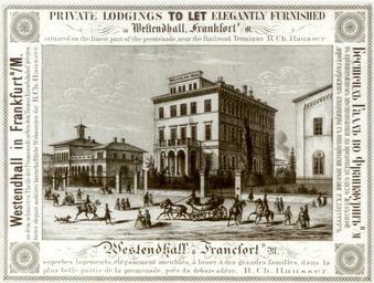 | Keywords: Frankfurt Westendhall.jpg Frankfurt am Main Germany Hotel Westendhall an der Taunusanlage vor der Wiedereröffnung 1853 Stahlstich Frankfurt am Main Stadtarchiv PD-old Demolished buildings in Frankfurt-Innenstadt Demolished buildings in Frankfurt-Bahnhofsviertel Taunusbahnhof Frankfurt 1853 in Frankfurt am Main |