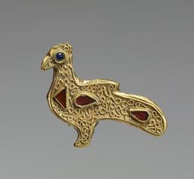 | Keywords: Frankish - Peacock-Shaped Fibula - Walters 57570.jpg This fibula is one of a pair crafted in a workshop in northern France The peacock likely reflects Roman or Byzantine influence as it is not native to northern France In early Christian art the peacock was a symbol of immortality Knowledge of the bird could have passed to northern France through the transmission of Christian iconography in textiles books and other portable objects The fibula originally was one of a pair of brooches worn by women on either side of the chest A second gold peacock fibula plausibly the mate to Walters 57 570 belongs to the Hungarian National Museum in Budapest mid-late 6th century Early Medieval gold over bronze with stones and glass paste cm 2 9 3 9 0 9 accession number 57 570 1573 Henry Walters Baltimore date of acquisition unknown by purchase Walters Art Museum Henry Walters Acquired by Henry Walters Early Christian and Byzantine Art Baltimore Museum of Art Baltimore 1947 4000 Years of Modern Art The Walters Art Gallery Baltimore; Baltimore Museum of Art Baltimore 1953-1957 Jewelry - Ancient to Modern The Walters Art Gallery Baltimore 1979-1980 Vive la France French Treasures from the Middle Ages to Monet place of origin north France Walters Art Museum license Fibulae with heads of birds with pointed beaks Medieval metalwork in the Walters Art Museum Jewellery in the Walters Art Museum Merovingian fibulae Peacocks in art Vive la France French Treasures from the Middle Ages to Monet Germanic animal style |