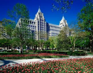 Keywords: franklin park washington d c city urban flowers plants tulips buildings nature outdoors idyll hdr