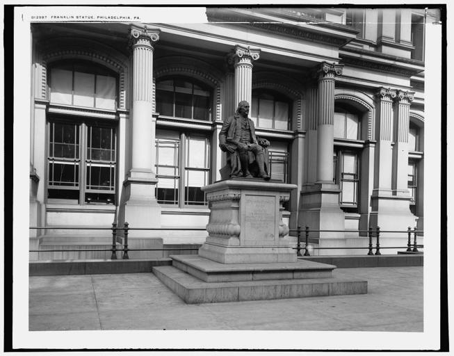 | Keywords: Franklin statue, Philadelphia, PA Detroit Pub. Co. c.1906.jpg en Franklin Statue Philadelphia PA Benjamin Franklin 1899 by John J Boyle in its original location in front of the Main Post Office 901 Chestnut Street Philadelphia Pennsylvania The sculpture was relocated to the University of Pennsylvania Library of Congress Detroit Publishing Company Collection http //www loc gov/pictures/item/det1994000566/PP/ Detroit Publishing Company<br>unidentified photographer 1900 1906 PD-Detroit Benjamin Franklin statue in front of College Hall University of Pennsylvania 1899 sculptures Philadelphia in the 1900s PD-US |
