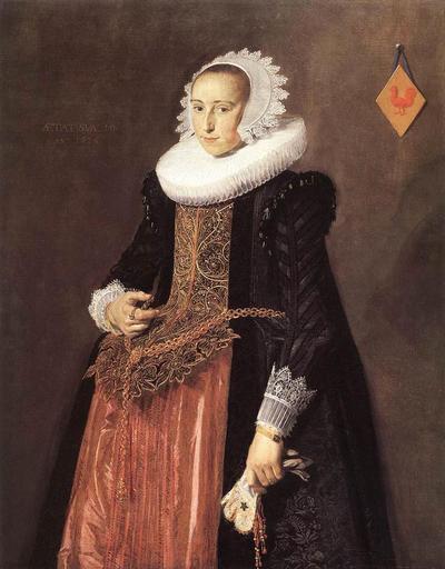 | Keywords: Frans Hals - Portrait d'Aletta Hanemans.jpg Artwork Creator Frans Hals Portrait of Aletta Hannemans who married Jacob Pietersz Olycan in 1624 and Nicolaes van Loo in 1640 She is shown three-quarters-length standing turned three-quarters left looking at the spectator She wears a costly bridal stomacher called a bruidsborst worked with gold thread and showing various flowers She wears it over a colorful purple and red skirt that is draped over a French fardegalijn which supports the heavy gold chain wrapped around her gown and through her vlieger Her vlieger is edged with black velvet and shows off her stomacher and skirt Her sleeves are attached via shoulder wings to her dress with small silver aglets Around her neck she wears a starched linen figure-eight collar and over her hair a diadem cap with lace edging She holds a pair of embroidered bridal gloves and wears a wedding ring on her right forefinger She also wears gold bracelets and lace wrist collars Pendant of File Frans Hals - Portrait of Jacob Olycan - Mauritshuis 459 jpg The paintings were restored in 2007 During restoration technical analysis confirmed what had long been thought that the poorly rendered coats of arms were later additions not by Frans Hals the pigment Prussian blue was found but this pigment was first synthesized in 1706 The decision was taken to over paint the arms Water soluble paints were used so that the over painting may be easily removed at a later date should this be wanted 1625 Ucfirst Oil on canvas cm 123 8 98 3 Institution Mauritshuis Ucfirst Anonymous portret-van-aletta-hanemans-16061653-460 LangSwitch Portrait of Aletta Hanemans 1606-1653 Portret van Aletta Hanemans 1606-1653 cm 123 8 98 3 Ucfirst Anonymous 10860 LangSwitch Portrait of Aletta Hanemans 1606-1653 Portret van Aletta Hanemans 1606-1653 cm 124 2 98 2 Ucfirst Anonymous 20186198 Porträt von Aletta Hanemans 1606-1653 der Ehefrau von Jacob Pietersz Olycan Size cm 124 2 98 2 Ucfirst Mauritshuis museum catalog 11 LangSwitch Portrait of Portret van Aletta Hanemans cite book Hofstede de Groot Cornelis A catalogue raisonne of the works of the most eminent Dutch painters of the seventeenth century Based on the work of John Smith https //archive org/stream/catalogueraisonn03hofsuoft page/62/mode/2up London Macmillan Co 1910 volume 3 208 63-64 i18n/catno 208 i18n/as Aletta Hanemans inch 48 5 38 5 object history ProvenanceEvent 1625 commission Jacob Olycan 1596 “1638 and Aletta Hanemans 1606-1653 Haarlem by 1877 inheritance Van Sypesteyn Haarlem ProvenanceEvent 1877-05-16 anonymous sale Van Pappelendam en Schouten Amsterdam bought in by 1880 Victor de Stuers 1843-1916 The Hague ProvenanceEvent 1881 purchase LangSwitch the Dutch State de Nederlandse staat Victor de Stuers The Hague from 1881 Mauritshuis The Hague exhibition history Frans Hals 1989-1990 Washington 181-184 19 color image credit line ÆTAT SVÆ 19 / AN<sup>o</sup> 1625 age of sitter / date top left la accession number 460 place of creation Haarlem web Frans Hals - Portrait of Aletta Hanemans - Mauritshuis 460 jpg Version after restoration from www mauritshuis nl Frans Hals 075 black and white jpg Version in black and white from mus cat c 1900 PD-old-100 ImageNote 1 65 208 150 55 782 1000 2 LangSwitch Inscription Inscriptie ÆTAT SVÆ 19 // ANo 1625 ImageNoteEnd 1 ImageNote 2 655 108 100 138 782 1000 2 LangSwitch Coat of arms Heraldisch wapen Hanemans ImageNoteEnd 2 DEFAULTSORT 1625; Aletta Hanemans Portrait paintings by Frans Hals 1625 Portrait2 Paintings by Frans Hals in the Mauritshuis 1625 Portrait2 Aletta Hannemans 1625 portrait paintings 1606 births 1653 deaths 17th-century oil portraits of standing women at three-quarter length 17th-century portrait paintings in the Netherlands 17th-century portraits with coat of arms Diadem caps Female portraits holding gloves People of the Northern Netherlands before 1830 Portrait paintings of women wearing white caps Ruffs in art female |