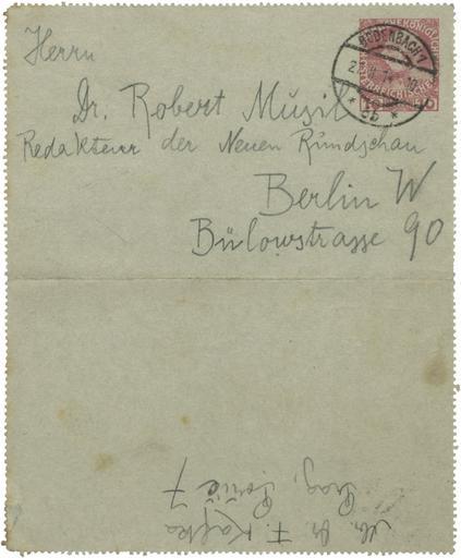 | Keywords: Franz Kafka an Robert Musil 1914-02-27 Umschlag.jpg Umschlag zu einem Brief von Franz Kafka an Robert Musil 27 Februar 1914; im Brief geht es um den Abdruck von Kafkas Erzählung Die Verwandlung nur in aller Kürze von einer kleinen aber sehr zerstreuenden und unruhig machenden Reise Sehr schade dass die ersten Briefe die wir wechseln Ihnen so kleinliche Schwierigkeiten bereiten müssen Machen Sie verehrter Herr Doktor mit der Geschichte was Sie wollen und was Ihnen nicht Mühe bereitet - es wird das Richtige sein Die Mitteilungen über Ihre Pläne die Sie mir in Aussicht stellen erwarte ich mit Freude der unedierte Brief leider im Katalog nicht abgebildet http //www bassenge com Galerie Bassenge 1914-02-27 Creator Franz Kafka PD-ineligible PD-old-70-1923 Images from Galerie Bassenge 1914 letters Franz Kafka Robert Musil Manuscript covers |