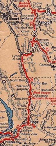 Keywords: map Detail of Shell Oil Co. Official Road Map of British Columbia, The H.M. Gousha Co., 1939. The Fraser Canyon Highway portion of the Cariboo Road ran from Hope to Lytton along the Fraser Canyon alongside the Canadian Pacific and Canadian National Railway lines. During this period, the highway was designated as B.C. Highway 'A'. In 1941, the road was re-assigned as B.C. Highway No. 1. Serious reconstruction of the old Cariboo Wagon Road for automobile use began by the Public Works Department in 1924-25. With the completion of the (second) Alexandra Suspension Bridge in 1926, the highway once again became passable to Lytton and beyond. In the years prior to the opening of the bridge, motor vehicles were suggested to "entrain" at Hope Station (Haig) with the CPR to Spences Bridge to travel to destinations in the Interior. To travel north beyond Yale from 1926 to 1947, motorists had to pay a toll which paid for the suspension bridge. In 1950, major improvements were proposed in accordance to the Trans-Canada Highway Agreement to bring the road to a national highway standard. Ambitious construction projects included a series of tunnels (constructed 1957-64), hillside reinforcements and bridges including the New Alexandra Bridge (1962). With the official opening dedications at Rogers Pass in the summer of 1962, the scenic road became part of the Trans-Canada Highway and a tourist attraction in its own right. Aside from the canyon itself, attractions included the Hell's Gate Fishway (completed 1946) and Airtram (opened 1971) and the North Bend Aerial Ferry (operated 1940-85). The current, modern tunnels are, from south to north: Yale (completed 1963), Saddle Rock (1958), Sailor Bar (1959), Alexandra (1964), Hell's Gate (1960), Ferrabee (1964) and China Bar (1961). With the opening of the Coquihalla Hightway (Hwy. 5) in 1986, the Fraser Canyon Highway ceased to be the primary route utilized by commercial and tourist drivers and has taken on a less hectic traffic pace. (And more so since the removal of the toll fees on the Coquihalla Highway since September 2008.) Detail of Shell Oil Co. Official Road Map of British Columbia, The H.M. Gousha Co., 1939. The Fraser Canyon Highway portion of the Cariboo Road ran from Hope to Lytton along the Fraser Canyon alongside the Canadian Pacific and Canadian National Railway lines. During this period, the highway was designated as B.C. Highway 'A'. In 1941, the road was re-assigned as B.C. Highway No. 1. Serious reconstruction of the old Cariboo Wagon Road for automobile use began by the Public Works Department in 1924-25. With the completion of the (second) Alexandra Suspension Bridge in 1926, the highway once again became passable to Lytton and beyond. In the years prior to the opening of the bridge, motor vehicles were suggested to "entrain" at Hope Station (Haig) with the CPR to Spences Bridge to travel to destinations in the Interior. To travel north beyond Yale from 1926 to 1947, motorists had to pay a toll which paid for the suspension bridge. In 1950, major improvements were proposed in accordance to the Trans-Canada Highway Agreement to bring the road to a national highway standard. Ambitious construction projects included a series of tunnels (constructed 1957-64), hillside reinforcements and bridges including the New Alexandra Bridge (1962). With the official opening dedications at Rogers Pass in the summer of 1962, the scenic road became part of the Trans-Canada Highway and a tourist attraction in its own right. Aside from the canyon itself, attractions included the Hell's Gate Fishway (completed 1946) and Airtram (opened 1971) and the North Bend Aerial Ferry (operated 1940-85). The current, modern tunnels are, from south to north: Yale (completed 1963), Saddle Rock (1958), Sailor Bar (1959), Alexandra (1964), Hell's Gate (1960), Ferrabee (1964) and China Bar (1961). With the opening of the Coquihalla Hightway (Hwy. 5) in 1986, the Fraser Canyon Highway ceased to be the primary route utilized by commercial and tourist drivers and has taken on a less hectic traffic pace. (And more so since the removal of the toll fees on the Coquihalla Highway since September 2008.) |