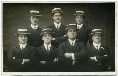 | Keywords: Fred C Palmer entertainers Herne Bay 2.jpg Postcard photo of a group of entertainers at Herne Bay Kent England dated 1903-1914 The photographer was Fred C Palmer of Tower Studio Herne Bay Kent who is believed to have died 1936-1939 ;Points of interest When Palmer took group photographs he usually took care to identify one of the subjects and make sure that he took a very good portrait of that person even if the other subjects were uncooperative or unable to pose attractively But these are self-aware entertainers though possibly amateur and this has facilitated seven satisfactory portraits showing the character of each They are wearing boaters signifying summer entertainment Border The remaining border of this image is important for researchers of this photographer Some photographers trimmed their images more than others and Palmer has a reputation for producing smaller postcards than other early 20th century UK photographers He took his own photos developed them in-house onto postcard-backed photographic paper and trimmed them himself It is worth adding that during hand-developing the border is actively masked with equipment which both crops the picture and causes the white frame or border to appear on the paper This frame is part of the design and is one of the reasons why the quality of Palmer's work is so interesting and why there is an article and category for him on English Wiki Researchers need to see exactly where the edge of the postcard is in the case of this picture there is no white frame on the paper but it is important to see exactly where the edge of the postcard is to see how Palmer has cropped it The cropping is part of the composition Thank you for taking the time to read this Scan of original postcard in my possession 1903-1914 Fred C Palmer died 1936-1939 out of copyright Different photo of same entertainers File Fred C Palmer entertainers Herne Bay jpg PD-old-70-1923 Herne Bay Kent Fred C Palmer of Herne Bay Entertainers from England Group portraits with 7 persons |