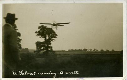 | Keywords: Fred C Palmer Salmet-Bleriot monoplane 1912.jpg Postcard photo of the Salmet-Bleriot monoplane landing near Herne Bay Kent England 1912 The postcard is dated 20 August 1912 The pilot was Henri Salmet who toured with a Bleriot plane in England in 1911-1913 Salmet is pictured at Llanelli in May of the same year in this image File Henri Salmet at Llanelli 1912 jpg The photographer was Fred C Palmer of Tower Studio Herne Bay Kent who died in 1941 This print has darkened with age but it would be inappropriate to adjust the brightness because detail would be lost Border The remaining border of this image is important for researchers of this photographer Some photographers trimmed their images more than others and Palmer has a reputation for producing smaller postcards than other early 20th century UK photographers He took his own photos developed them in-house onto postcard-backed photographic paper and trimmed them himself This is one of the reasons why the quality of his work is so interesting and why there is an article and category for him on English Wiki Researchers need to see exactly where the edge of the postcard is Thank you for taking the time to read this ;Points of interest Palmer has managed to get the moving plane sufficiently in focus for a postcard although the rest of the image is blurred This is quite an achievement because he could not have known the exact direction in which the plane would land; therefore he could not measure the distance for focus beforehand Palmer would have used a field camera with a half-plate glass If you zoom in to the plane you can see Salmet's head The plane looks very fragile Scan of original postcard in my possession Contains letter dated 20 August 1912 and postmark dated August 1912 Fred C Palmer died 1941 Out of copyright PD-old-70-1923 Fred C Palmer of Herne Bay Blériot aircraft on postcards Henri Salmet |