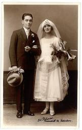 | Keywords: Fred C Palmer Swindon wedding couple 002.jpg Portrait photo of a wedding couple at Swindon Wiltshire England in the 1920s or 30s From a postcard deposited at Swindon Record Office and scanned and uploaded by them to Flickr The photographer was Fred C Palmer of Tower Studio Herne Bay Kent ca 1905-1916 and of 6 Cromwell Street Swindon ca 1920-1936 He is believed to have died 1936-1939 ;Points of interest It is considered lucky in the UK for brides to wear something borrowed; perhaps in this case it is the satin shoes which are not as new as the other clothes Palmer had an eye for a pretty face and for posing pretty girls to best advantage This is an example of his skill Border The remaining border of this image is important for researchers of this photographer Some photographers trimmed their images more than others and Palmer has a reputation for producing smaller postcards than other early 20th century UK photographers He took his own photos developed them in-house onto postcard-backed photographic paper and trimmed them himself It is worth adding that during hand-developing the border is actively masked with equipment which both crops the picture and causes the white frame or border to appear on the paper This frame is part of the design and is one of the reasons why the quality of Palmer's work is so interesting and why there is an article and category for him on English Wiki Researchers need to see exactly where the edge of the postcard is Thank you for taking the time to read this http //www flickr com/photos/swindonlocal/5539642994/ 1920-1930s Fred C Palmer died 1936-1939 out of copyright PD-art-70 Fred C Palmer of Swindon Black and white photographs of marriage Wedding ceremonies in the United Kingdom |