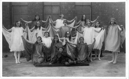 | Keywords: Fred C Palmer Swindon Greek dancing portrait 036.jpg Postcard photo of schoolgirls dressed for Greek dancing in or near Swindon Wiltshire England The photographer was Fred C Palmer of Tower Studio Herne Bay Kent ca 1905-1916 and of 6 Cromwell Street Swindon ca 1920-1936 He is believed to have died 1936-1939 ;Points of interest From the 1920s to around the 1960s numerous girls' schools in the UK taught Greek Dancing in the manner of Isadora Duncan The girls had to wear cotton fabric costumes cut from a pattern designed by Duncan in a selection of pastel colours as worn by her dancers The dance movements imitated some of the female poses exactly as seen on ancient Greek vases This included walking sideways with body facing forward as depicted on the ancient urns This dancing-style was favoured by schools which hoped to improve deportment and posture of pupils The countryside themes of Greek Dancing may be reflected here by the costume of the seated girl at the front Greek Dancing in the tradition of Isadora Duncan was usually performed in bare feet although these girls may be wearing shoes Editing The remaining border of the first upload of this image is important for researchers of this photographer Some photographers trimmed their images more than others and Palmer has a reputation for producing smaller postcards than other early 20th century UK photographers He took his own photos developed them in-house onto postcard-backed photographic paper and trimmed them himself It is worth adding that during hand-developing the border is actively masked with equipment which both crops the picture and causes the white frame or border to appear on the paper This frame is part of the design and is one of the reasons why the quality of Palmer's work is so interesting and why there is an article and category for him on English Wiki Researchers need to see exactly where the edge of the postcard is Thank you for taking the time to read this Photograph of original postcard s 1920 or 1930s Fred C Palmer died 1936-1939 out of copyright PD-art-70 Fred C Palmer of Swindon Isadora Duncan Postcards of dancers |