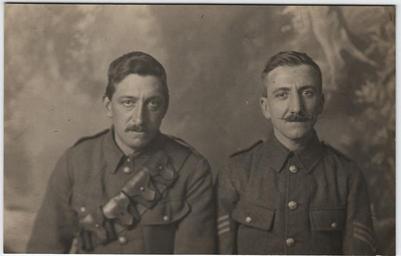 | Keywords: people groupshot Frederick and George William Aimson, brothers of Alice Aimson, wife of William Robert Cannell. Frederick joined the Royal Garrison Artillery in November 1914 and first went to France on 7 July 1915. He served in a Trench Mortar Battery in 18th Division and II Corps, and was gassed in July 1917 but survived. George William Aimson was a tailor and lived at the Red Lion in Tilstock, Shropshire. He served in a training battalion in Britain throughout WW1 and was promoted to Sergeant. He died of TB in 1919 after being discharged from the army as no longer fit for service, and has a CWGC headstone. Frederick and George William Aimson, brothers of Alice Aimson, wife of William Robert Cannell. Frederick joined the Royal Garrison Artillery in November 1914 and first went to France on 7 July 1915. He served in a Trench Mortar Battery in 18th Division and II Corps, and was gassed in July 1917 but survived. George William Aimson was a tailor and lived at the Red Lion in Tilstock, Shropshire. He served in a training battalion in Britain throughout WW1 and was promoted to Sergeant. He died of TB in 1919 after being discharged from the army as no longer fit for service, and has a CWGC headstone. |