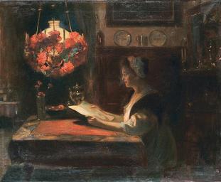 | Keywords: Frederick Vezin Evening Reading.jpg Evening Reading oil on canvas 74 x 90 5 cm http //www agra-auctions com/auction php off 60 curr USD id_aukcji 174 by 1933 Frederik Vezin 1859-1933 PD-old-70 Frederick Vezin Paintings of sitting women reading indoors People with lamps in art Evening in art |
