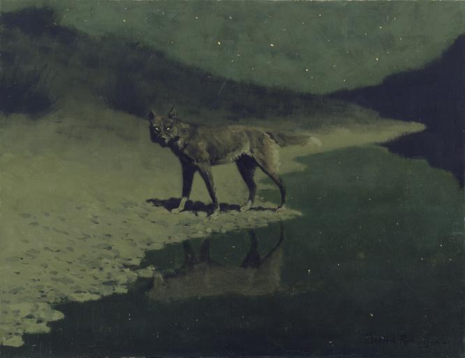 | Keywords: FredericRemington-Moonlight Wolf c1909.jpg Artwork creator Frederic Remington 1909 oil canvas cm 50 96 66 04 Institution Addison Gallery of American Art accession number 1956 2 http //accessaddison andover edu/Obj4094 sid 22488 x 340650 Addison Gallery of American Art object history credit line gift of the members of the Phillips Academy Board of Trustees on the occasion of the 25th Anniversary of the Addison Gallery Frederic Remington ~ lower right signature http //arthistory about com/od/from_exhibitions/ig/afa_coaa_0708/coaa_10 htm about com PD-old-100-1923 1909 Paintings by Frederic Remington Paintings in the Addison Gallery of American Art Paintings of wolves Moonlight in paintings 1909 paintings |