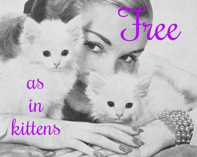 MAKE A MEME View Large Image freeasinkittens freesoftware woman kitten kittens free freedoms software gpl gnu opensource open openculture remixculture remix community communitysoftware We’re all familiar with free as in beer v. free as in speech, but perhaps “free ...
