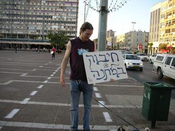 Keywords: Free Hugs in Tel-Aviv-Yafo.jpg A 'FREE HUGS' volunteer with a Hebrew sign Own Free Hugs Free signs Hebrew language signs Rabin Square