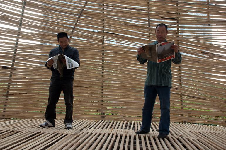 Keywords: Free newspaper Cicada by Nikita Wu.jpg en Visitors reading the free newspaper Cicada edited by Nikita Wu at the Bug Dome of the WEAK architects in the SZHK Biennale 2009 own Movez 2009 Nikita Wu Bug Dome by WEAK Newspaper readers Sudare Wooden objects Sunshades
