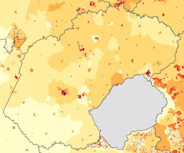 Keywords: Free State 2001 population density map.svg ffffcc <1 inhabitant/km² ffeda0 1 “3 inhabitants/km² fed976 3 “10 inhabitants/km² feb24c 10 “30 inhabitants/km² fd8d3c 30 “100 inhabitants/km² fc4e2a 100 “300 inhabitants/km² e31a1c 300 “1000 inhabitants/km² bc0026 1000 “3000 inhabitants/km² 800026 >3000 inhabitants/km² Projection is Albers Equal-Area Conic with standard parallels at 25 5° S and 31 5° S and origin at 28 5° S 25 5° E Statistics South Africa's Census 2001 is the source of the basic population data The map results from my own processing of the data Htonl 2010-02-10 Superseded demographic maps of South Africa Maps of the Free State The following license applies to the population data on which the map is based http //www statssa gov za/copyrightdisclaimer asp the user acknowledges Stats SA as the source of the basic data wherever they process apply utilise publish or distribute the data and also that they specify that the relevant application and analysis where applicable result from their own processing of the data The following tag applies to the map itself |