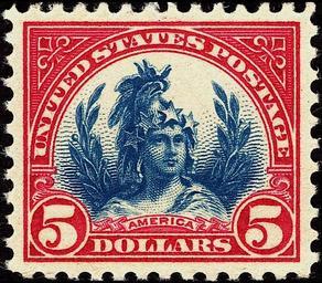 | Keywords: Freedom 1923-$5.jpg en US Postage Stamp Freedom 5 blue and red U S Post Office<br/>http //arago si edu/index asp con 1 cmd 1 tid 2033946 Smithsonian National Postal Museum<br/>Photo image obtained/rendered by Gwillhickers U S Bureau of Engraving and Printing; Designed by Clair Aubrey Houston 1923 PD-USGov Stamps of the United States 1921-1930 1923 stamps Red stamps Definitive stamps of the United States Stamps designed by Clair Aubrey Houston | ||||