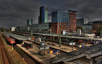 Keywords: freiburg city germany railway station train gleise view travellers passenger train building skyscraper hdr seemed platform stairs