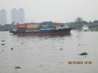 Keywords: Freight barges on the 'Saigon River'.JPG en A barge transporting container cargo on the Saigon river own Rudolph A Furtado Monday 9-12-2013 Transport in Ho Chi Minh City Cc-zero