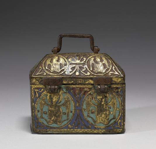 Keywords: French - Chrismatory - Walters 44102 - Back.jpg A chrismatory served as a container for the three vials of holy oil or chrism used in church rites These were the oil for the consecration of priests and churches the oil for confirmation of the young and the oil for the last rites of the dying This chrismatory decorated with engraved busts of angels would have been supported by gilded copper feet middle Other date century 13 Medieval champlevé enamel on copper with gilding cm 11 10 9 7 1 H with handle down cm 9 6 accession number 44 102 5063 Henry Walters Baltimore date of acquisition unknown by purchase Walters Art Museum Henry Walters Acquired by Henry Walters place of origin Limoges France Walters Art Museum license Medieval metalwork in the Walters Art Museum Limoges champlevé Art of France in the Walters Art Museum Media contributed by the Walters Art Museum needs category review |