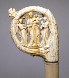 | Keywords: French - Crozier with the Virgin and Child, and the Crucifixion - Walters 71231 - Side A.jpg Croziers or staffs of office in the form of shepherds' crooks were carried by both bishops and abbots Carved on one face of the crozier are the Virgin and St John flanking the Crucified Christ; on the other the Virgin holds the Christ child between two candle-bearing angels The fine carving of the figures is complemented by such details as the delicate vine leaves around the edges of the scenes A few ivory croziers are known from this period but the majority were made of pieces of rock crystal and enameled and gilded copper between 1350 1360 Medieval ivory cm 13 5 11 6 2 6 accession number 71 231 7509 John Edward Taylor London date and mode of acquisition unknown John Edward Taylor Sale London July 1 1912 no 82 Seligmann Brothers New York date and mode of acquisition unknown Henry Walters city Baltimore Walters Art Museum Henry Walters Acquired by Henry Walters 1913 Treasures from Medieval France The Cleveland Museum of Art Cleveland 1966-1967 Ivory The Sumptuous Art The Walters Art Gallery Baltimore 1983-1984 Images in Ivory Precious Objects of the Gothic Age The Detroit Institute of Arts Detroit; The Walters Art Gallery Baltimore 1997 Vive la France French Treasures from the Middle Ages to Monet The Walters Art Gallery Baltimore 1999-2000 place of origin Paris France Walters Art Museum license Medieval ivory in the Walters Art Museum Art of France in the Walters Art Museum Ivory croziers Sculptures of Madonna and Child Vine leaves in art Vive la France French Treasures from the Middle Ages to Monet |