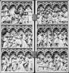 | Keywords: French - Diptych with Scenes from the Passion of Christ - Walters 71179.jpg By the middle of the 14th century the ivory workshops of Paris were creating large-scale diptychs two hinged panels with numerous scenes from the Passion cycle Thirteen are found here reading from top to bottom and left to right Christ's Entry into Jerusalem the Washing of the Feet the Last Supper the Garden of Gethsemane the Arrest of Christ the Hanging of Judas the Flagellation of Christ Christ bearing the Cross to Calvary the Crucifixion the Deposition Entombment Christ appearing to Mary Noli me tangere and Christ's Descent into Limbo Notably Parisian in style are the slender figures with their swayed elegant poses and smooth drapery folds Diptychs were used as aids in prayer by the wealthy owners who commissioned them between 1350 1365 Medieval ivory with traces of paint and gilding cm 25 23 2 1 accession number 71 179 25829 Listed in an inventory dated 1430 of the Treasury of the Cathedral of Vich Catalonia Museum at Vich Spain until 1903 Henry Walters Baltimore date of acquisition unknown by purchase Walters Art Museum Henry Walters Acquired by Henry Walters The International Style The Arts in Europe Around 1400 The Walters Art Gallery Baltimore 1962 Ivory The Sumptuous Art The Walters Art Gallery Baltimore 1983-1984 Images in Ivory Precious Objects of the Gothic Age The Detroit Institute of Arts Detroit; The Walters Art Gallery Baltimore 1997 place of origin Paris France Walters Art Museum license Medieval ivory in the Walters Art Museum Art of France in the Walters Art Museum Media contributed by the Walters Art Museum needs category review |