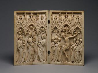 | Keywords: French - Diptych with the Virgin and Child, and the Crucifixion - Walters 71276 - Open.jpg On this diptych the emotional quality of the Crucifixion is increased by the detail of the blood that spurts from Christ's side and pierces the Virgin's breast like a knife This motif probably originated in Germany and was derived from the prophecy of the holy man Simeon in the Gospel of Luke that a sword would pierce the Virgin's soul as a mark of her special suffering between 1350 1360 Medieval ivory with traces of paint cm 20 5 26 2 1 accession number 71 276 37105 George de Waroquier Toulouse Sigismond Bardac Paris Arnold Seligmann New York Henry Walters city Baltimore Walters Art Museum Henry Walters Acquired by Henry Walters 1922 On the back of the right leaf inscribed in faded ink Ardenus Grassus de Morario loci de Burossa Lascurensis diocesis; Traslation Ardenus Grassus de Morario of Buros in the diocese of Lascar The International Style The Arts in Europe Around 1400 The Walters Art Gallery Baltimore 1962 Les Fastes du Gothique le Siècle de Charles V Galeries nationales du Grand Palais Paris 1981-1982 place of origin Paris France Walters Art Museum license Medieval ivory in the Walters Art Museum Art of France in the Walters Art Museum Media contributed by the Walters Art Museum needs category review Sculptures of Madonna and Child Ivory |