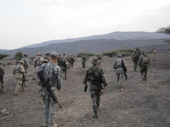 | Keywords: French, Djiboutian, US service members survive the desert 110913-N-MJ000-262.jpg en More than 150 service members from the French Djiboutian and United States militaries walk across the Djibouti desert during a 5th French Marine Regiment-sponsored desert combat training course Sept 13 The service members navigated 50 miles of Djiboutian desert by foot during the 10-day course Forty members of the Combined Joint Task Force - Horn of Africa and Camp Lemonnier Djibouti participated in the training <br>Unit Combined Joint Task Force - Horn of Africa 2011-09-13 U S Navy photo by Lieutenant Mark Jackson https //www dvidshub net/image/471437/french-djiboutian-us-service-members-survive-desert 110913-N-MJ000-262 2011-10-10 09 33 CAMP LEMONNIER DJ PD-USGov-Military-Navy Combined Joint Task Force - Horn of Africa Camp Lemonnier Images from DoD uploaded by Fæ |