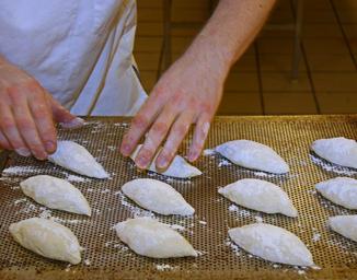 Keywords: french gross bun dough formes bun baker food dining oven speciality craft freshly baked bakes bread production taste work mapped out hand-shaped rolled raw dough toss in flour ready for the oven put on the griddle