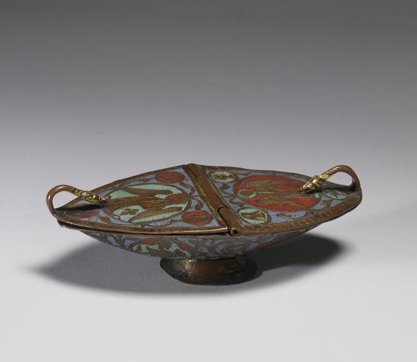 | Keywords: French - Incense Boat - Walters 44701 - Three Quarter.jpg This incense boat called a navicula Latin for little boat was used to store the incense that was burned as part of many church rituals including the Mass The boat has curved dragon-headed handles on the lid for the symbolic protection of the incense a combination of frankincense and myrrh The burning of incense was considered both an offering to God and an act of purification middle Other date century 13 Medieval champlevé enamel on copper with gilding cm 5 9 8 6 18 2 accession number 44 701 38824 Dimitri Schevitch Paris before 1906 Sale Georges Petit Paris April 4-7 1906 no 205 Octave Pincot Paris 1906 by purchase Ernst and Martha Kofler-Truniger Lucerne 1964 by purchase Keir Collection Edmund de Unger London 1971 by purchase Keir Collection Sale Sotheby's New York November 20 1997 no 87 Walters Art Museum 1997 by purchase Museum purchase with funds provided by the Richard H Randall Jr Memorial Fund and the W Alton Jones Foundation Acquisition Fund 1997 Medieval Enamels Masterpieces from the Keir Collection The British Museum London 1981-1982 Sammlung E und M Kofler-Truniger Luzern Kunsthaus Zürich Zurich 1964 Mittelalterliche Kunst der Sammlung Kofler-Truniger Suermondt Museum Aachen 1965 Highlights from the Collection The Walters Art Gallery Baltimore 1998-2001 Vive la France French Treasures from the Middle Ages to Monet The Walters Art Gallery Baltimore 1999-2000 place of origin Limoges France Walters Art Museum license Medieval metalwork in the Walters Art Museum Champlevé of Europe Art of France in the Walters Art Museum Incense boats Media contributed by the Walters Art Museum needs category review Vive la France French Treasures from the Middle Ages to Monet |