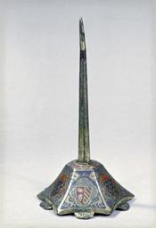 | Keywords: French - Pricket Candlestick - Walters 44596.jpg The base of this pricket candlestick bears the combined arms of Bernard VIII d 1339 count of Comminges and those of his second wife Marguerite de Turenne alternating with the fleur de lys the heraldic emblem of the royal house of France Although such personal items were often commissioned as gifts to commemorate special events coats of arms did not necessarily refer to a specific patron but were part of workshops' decorative repertoire early Other date century 14 Medieval champlevé enamel on copper cm 17 9 9 4 10 accession number 44 596 31387 Baron Pichon Paris ca 1897 by purchase John E Taylor London by purchase Sale London 1912 no 61 Raphael Stora Paris and New York by purchase Joseph Brummer Paris by purchase Brummer Sale Parke-Bernet New York April 23 1949 no 715 Walters Art Museum 1949 by purchase Museum purchase 1949 Illuminated Manuscripts Masterpieces in Miniature The Walters Art Gallery Baltimore 1984-1985 Russian Enamels The Walters Art Gallery Baltimore 1996-1997 place of origin Limoges France Walters Art Museum license Medieval metalwork in the Walters Art Museum Champlevé of Europe Art of France in the Walters Art Museum Media contributed by the Walters Art Museum needs category review |