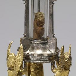 | Keywords: French - Reliquary for a Finger Bone - Walters 57690 - Detail A.jpg Three angels elevate the hollow glass cylinder of this reliquary a type of dramatic display reliquary that became popular in the late Middle Ages Inside is the relic of an unknown saint a small fragment of a bone possibly from a finger wrapped in a piece of cloth century 15 Late Medieval silver gilded copper glass textile human bone cm 22 5 8 4 8 4 accession number 57 690 16102 Michel Boy Paris by purchase Sale Hotel Drouot Paris May 15 1905 no 661 Henry Walters city Baltimore Walters Art Museum Henry Walters Acquired by Henry Walters 1905 Reliquaries and Ritual Medieval Objects of Devotion The Walters Art Gallery Baltimore 1984-1985 place of origin Flanders Belgium Walters Art Museum license Medieval metalwork in the Walters Art Museum Medieval reliquaries Renaissance applied arts in the Walters Art Museum Art of France in the Walters Art Museum Media contributed by the Walters Art Museum needs artist review |