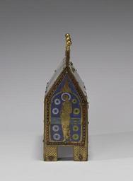| Keywords: French - Reliquary Shrine of St Martial - Walters 44119 - Side D.jpg the scene depicted on the roof of this chasse is ambiguous lacking identifying inscriptions or attributes The figure whose arm Christ grasps has been identified with several saints including Marial of Limoges a popular regional saint who was believed to have raised people from the dead While the image might celebrate that event it could also commemorate Christ's Harrowing of Hell when Christ following his Resurrection rescued the virtuous souls imprisoned there who had died before the Incarnation It is possible that the scene's ambiguity is unintentional but a certain degree of ambiguity might have enabled the object to serve in different devotional contexts ca 1200 1210 Medieval champlevé enamel on copper with gilding glass H 9 x W at top finials 9 1/16 x D 3 5/8 in 22 9 x 23 02 x 9 21 cm accession number 44 119 14654 Ottile Goldschmidt-Przibram Brussels by purchase Sale Frederik Muller Cie Amsterdam June 19 1924 no 132 Brimo de Laroussilhe Paris date of acquisition unknown by purchase Henri Daguerre Paris date of acquisition unknown by purchase Henry Walters city Baltimore Walters Art Museum Henry Walters Acquired by Henry Walters 1928 A Medieval Treasury from Southern Collections Ackland Art Center University of North Carolina at Chapel Hill Chapel Hill 1961 Reliquaries and Ritual Medieval Objects of Devotion The Walters Art Gallery Baltimore 1984-1985 Vive la France French Treasures from the Middle Ages to Monet The Walters Art Gallery Baltimore 1999-2000 Treasures of Heaven The Cleveland Museum of Art Cleveland; The Walters Art Museum Baltimore; The British Museum London 2010-2011 place of origin Limoges France Walters Art Museum license Medieval metalwork in the Walters Art Museum Champlevé of Europe Limoges champlevé Medieval reliquaries Art of France in the Walters Art Museum Vive la France French Treasures from the Middle Ages to Monet |