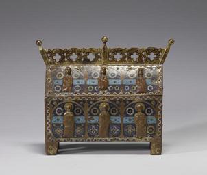| Keywords: French - Reliquary Shrine with Christ and Apostles - Walters 44106 - Side A.jpg A reliquary shrine was made to hold the precious relics or remains of a saint On this example Christ is seated at the center of both the roof and the lower panel flanked by a pair of apostles under gracefully curving arches The half-length figures were made separately and attached to the brightly colored enamel surfaces early Other date century 13 Medieval champlevé enamel on copper with gilding cm 23 5 27 5 9 5 accession number 44 106 9032 Prince de Wagram Boissy-Saint-Leger Brimo de Laroussilhe Paris by purchase Henri Daguerre Paris by purchase Henry Walters city Baltimore Walters Art Museum Henry Walters Acquired by Henry Walters 1928 Enamels Museum of Contemporary Crafts New York 1959 The Arts of Man Dallas Museum of Art Dallas 1962 place of origin Limoges France Walters Art Museum license Medieval metalwork in the Walters Art Museum Champlevé of Europe Limoges champlevé Medieval reliquaries Art of France in the Walters Art Museum |