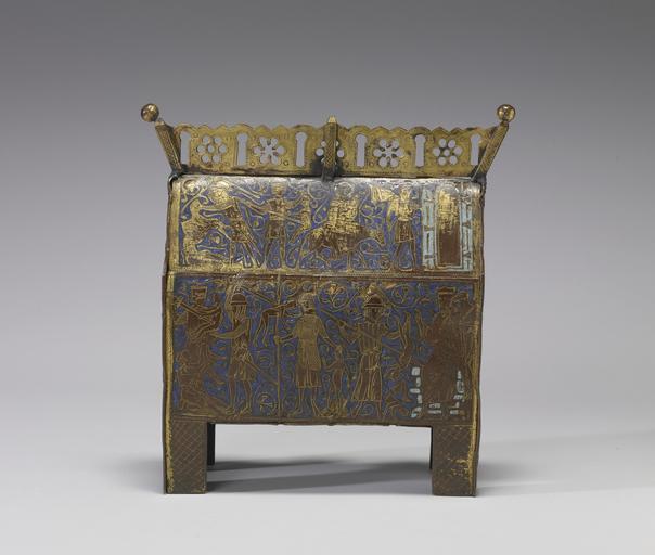 Keywords: French - Reliquary Shrine with Scenes from the Life of Christ - Walters 444 - Side C.jpg One long side of this shrine shows the Massacre of the Innocents with the dog-faced Devil counseling the enthroned King Herod at the far right of the lower panel Above the Virgin and Child are led by Joseph toward an open gateway to flee into Egypt from the slaughter shown behind and below them The opposite long side has cast figures of Christ enthroned between Apostles John and James above and the Virgin with the Christ Child in her lap between Archangels Raphael and Gabriel below The Annunciation is displayed on one end The shrine has lost its wooden core as well as the door that once sealed the relics inside middle Other date century 13 Medieval champlevé enamel on copper with gilding cm 24 23 5 8 5 accession number 44 4 24165 From Toulouse archives of Brimo de Laroussilhe Brimo de Laroussilhe Paris by purchase Henri Daguerre Paris by purchase Henry Walters city Baltimore Walters Art Museum Henry Walters Acquired by Henry Walters 1928 Inscribed on band along the roof of the chasse on Christ Enthroned side SCS IA/COBUS SALVA/TOR MUNDI / SCS IOHS ; Transcription SANCTUS IA/COBUS SALVA/TOR MUNDI / SANCTUS IOHANNES ; Translation Saint James the Savior of the World Saint John Inscribed on band along top of the lower panel on Christ Enthroned side SCS/ MICAEL SCA/ MARIA SCS G/ABRIEL; Transcription SANCTUS/ MICHAEL SANCTA/ MARIA SANCTUS G/ABRIEL; Translation Saint Michael Saint Mary Saint Gabriel Reliquaries and Ritual Medieval Objects of Devotion The Walters Art Gallery Baltimore 1984-1985 place of origin Limoges France Walters Art Museum license Medieval metalwork in the Walters Art Museum Champlevé of Europe Limoges champlevé Medieval reliquaries Art of France in the Walters Art Museum |