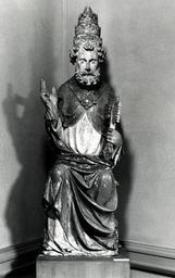 | Keywords: French - Saint Peter Enthroned - Walters 27269.jpg St Peter is enthroned one hand raised in blessing and the other holding the keys to heaven and earth granted him by Christ Although Peter was never a pope the office had not been created then he was acknowledged by Christ as the head and foundation stone Peter means rock in Aramaic of the new church Revered by the Catholic Church as the first bishop of Rome from whom the institution of the papacy developed he is often represented as a pope to underline this link The form of the papal crown worn by Peter is significant It is a triple crown the form adopted by the popes during the years the papacy was established in Avignon 1309-77 The statue is datable to the following years of schism in the Church between Rome and Avignon; the triple crown may signal the local bishop's allegiance to the current French pope Clement VII Meant to be seen from below the saint's upper body is elongated to accommodate the distortion this viewing angle would cause ca 1375 1400 Medieval limestone with paint cm 119 accession number 27 269 38844 Arnold Seligmann Rey and Co New York by purchase Henry Walters city Baltimore Walters Art Museum Henry Walters Acquired by Henry Walters 1919 The International Style The Arts in Europe Around 1400 The Walters Art Gallery Baltimore 1962 place of origin Caen France Walters Art Museum license Medieval art in the Walters Art Museum Art of France in the Walters Art Museum Media contributed by the Walters Art Museum needs category review |