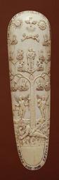 | Keywords: French - Tobacco Grater with Tree of Jesse - Walters 71328.jpg The face of the grater is carved in low relief with the Tree of Jesse illustrating the descent of Christ from the royal line of David Jesse reclines asleep amid the roots of the tree Flanking the trunk are two winged putti representing Virtues One on the left bears scales and a trumpet and the other on the right holds a cornucopia and a sword Above the bifurcation of the trunk the Virgin holding the Infant Christ stands on the crescent moon Two adoring cherubs kneel on boughs at the Virgin's feet; cherubs holding the crown hover overhead The kings are placed among leafy branches Nine of them hold scepters while the tenth David plays his harp At the top hovers the dove of the Holy Ghost flanked by the sun and the moon Incised and blackened on scrolls at the top and bottom is the inscription LAPURTE FAIT MON ESTIME DE GLOIRE ET D'HONNEUR LE CIEL MEN VIRONNE I esteem purity; the sky surrounds me with glory and honor The concave reverse of the grater is grooved and fitted with a central flange to accommodate a metal grate Inscribed on the edge of the reverse is JE SVIS CETTE RASPE CVRIEVZE DE QVI CHACHVN EST AMOVREVEX ON MEFLERE LON MECARESSE ET SOVENT JE SERS DE DIVERTISEMENT ENTRE LES MAINS DE MON MESTRE I am this curious rasp of whom everyone is enamored One sniffs me one caresses me and often I am a pleasure in the hands of my owner This tobacco grater differs in form from those associated with Dieppe in that it lacks a compartment to collect the grated snuff Inscribed in ink on the reverse are two ciphers A 185/BA and W 247c 99c There is also a paper label bearing the number 154 middle Other date century 18 ivory cm 19 6 accession number 71 328 29859 Paris Henry Walters city Baltimore Walters Art Museum Henry Walters Acquired by Henry Walters 1924 Transcription Incised and blackened on scrolls at the top and bottom of the front LAPURTE FAIT MON ESTIME DE GLOIRE ET D'HONNEUR LE CIEL MEN VIRONNE; Translation I esteem purity; the sky surrounds me with glory and honor; Transcription Inscribed on the edge of the reverse JE SVIS CETTE RASPE CVRIEVZE DE QVI CHACHVN EST AMOVREVEX ON MEFLERE LON MECARESSE ET SOVENT JE SERS DE DIVERTISEMENT ENTRE LES MAINS DE MON MESTRE; Translation I am this curious rasp of whom everyone is enamored One sniffs me one caresses me and often I am a pleasure in the hands of my owner; Transcription Inscribed in ink on the reverse A 185/BA; Transcription Inscribed in ink on the reverse W 247c 99c; Number On a paper label 154 place of origin France Walters Art Museum license Media contributed by the Walters Art Museum needs category review Art of France in the Walters Art Museum Snuffboxes |