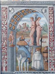 Keywords: frescos house painting mural several renaissance caught tied up man woman naked pillory knight castle