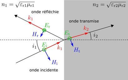| Keywords: Fresnel-equations-sketch-ET-fr.svg Fresnel equations sketch of incident reflected and transmitted waves for transverse electrical polarisation Are drawn and labelled electric fields E perp to the plane and magnetic fields B in the plane perp to the beam as well as angles with the normal wave numbers vectors along the beams and refracting indices Coefficients de Fresnel schéma des ondes incidente réfléchie et transmise pour la polarisation électrique transverse Sont indiqués les champs électriques E perp au plan et magnétiques B dans le plan perp à la direction de propagation ainsi que les angles d'incidence et de réfraction les nombres d'onde vecteurs le long de la direction de propagation et les indices de réfractions Fresnelsche Formeln Skizze der einfallenden reflektierten und transmittierten Wälen für eine senkrechte Polarisation Wureden gezeichnet die elektrische E and magnetische B Felder Winkel Wälennummer und Brechungsindexe Own Brachycerophilia 2008-06-02 Fresnel equations diagrams Created with Inkscape |