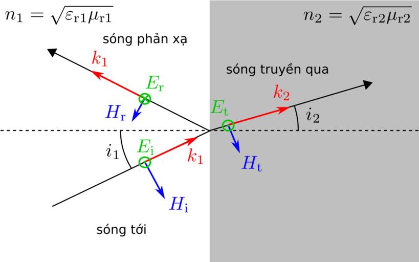 Keywords: Fresnel-equations-sketch-ET-vi.svg Fresnel equations sketch of incident reflected and transmitted waves for transverse magnetical polarisation Are drawn and labelled electric fields E and magnetic fields B as well as angles with the normal wave numbers and refracting indices Coefficients de Fresnel schéma des ondes incidente réfléchie et transmise pour la polarisation magnétique transverse Sont indiqués les champs électriques E et magnétiques B ainsi que les angles d'incidence et de réfraction les nombres d'onde et les indices de réfractions Fresnelsche Formeln Skizze der einfallenden reflektierten und transmittierten Wälen für eine parallele Polarisation Wureden gezeichnet die elektrische E and magnetische B Felder Winkel Wälennummer und Brechungsindexe Translated from Image Fresnel-equations-sketch-ET-fr svg Brachycerophilia User Tttrung 2008-06-02 2008-10-09 Fresnel equations diagrams Created with Inkscape |