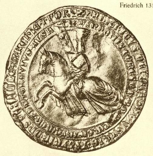Keywords: FridrichSlicny.jpg This is a scan of the historical document Title Die Siegel der deutschen Kaiser und Könige v 1 751 - 1347 scan from original book 1909 Otto Posse 1847-1921 Out of copyright as author died more than 70 years ago http //upload wikimedia org/wikipedia/commons/9/9f/Posse_Band_1_0087 jpg PD-old Frederick I of Austria Habsburg Medieval seals Posse Die Siegel der deutschen Kaiser und Könige v 1 Equestrian seals