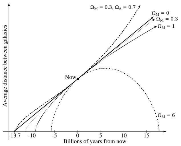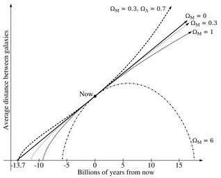 | Keywords: Friedmann universes.svg Intended as a replacement for File Universe svg and File Universos gif Improvements better dash patterns more accurate curves actual solutions of the Friedmann equations not hand-drawn Own 2009-09-23 BenRG Public domain Formulas This diagram uses the following exact solutions to the Friedmann equations <math>\begin cases a t H_0 t \Omega_M \Omega_\Lambda 0 \\ \begin cases a q \tfrac \Omega_M 2 1-\Omega_M \cosh q - 1 \\ t q \tfrac \Omega_M 2H_0 1-\Omega_M 3/2 \sinh q - q \end cases 0 < \Omega_M < 1 \ \Omega_\Lambda 0 \\ a t \left \tfrac32 H_0 t \right 2/3 \Omega_M 1 \ \Omega_\Lambda 0 \\ \begin cases a q \tfrac \Omega_M 2 \Omega_M-1 1-\cos q \\ t q \tfrac \Omega_M 2H_0 \Omega_M-1 3/2 q - \sin q \end cases \Omega_M > 1 \ \Omega_\Lambda 0 \\ a t \left \tfrac \Omega_M \Omega_\Lambda \sinh 2 \left \tfrac32 \sqrt \Omega_\Lambda H_0 t \right \right 1/3 0 < \Omega_M < 1 \ \Omega_\Lambda 1 - \Omega_M \end cases </math> See also Some of the shown models are implemented as an animation at Cosmos-animation Check categories 2009 October 31 en wikipedia Hubble's_law en wikipedia Ultimate_fate_of_the_universe Physics 6 Eschatology Popular culture Large-scale structure of the cosmos Cosmology Future |