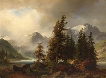 | Keywords: Friedrich Preller d.Ä. - Blick auf eine alpine Landschaft.jpg Artwork Creator Friedrich Preller der Ältere probably s 1840 oil on canvas cm 33 43 accession number object history Private collection Hannover credit line Preller lower left signature http //www sothebys com/en/auctions/ecatalogue/2007/an-important-private-collection-from-hanover-am1020/lot 244 html Sotheby's Amsterdam 27-29 March 2007 lot 244 <gallery>File Preller Norwegian landscape jpg langSwitch Ein ähnliches Motiv mit norwegischer Landschaft von Preller d Ä im Nationalmuseum in Warschau a similar painting by Preller I in the National Museum Warsaw </gallery> PD-old-100-1923 1878 Friedrich Preller der Ältere Paintings of the Alps 19th-century mountain paintings 1840s landscape paintings Images from Sotheby's |