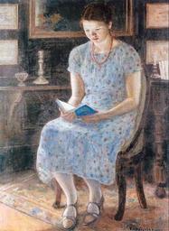 | Keywords: Frieseke Blue girl reading.jpg Blue girl reading oil on canvas 53 x 38 in private collection http //artinconnu blogspot com 1935 Creator Frederick Carl Frieseke PD-old-auto 1939 Frederick Carl Frieseke Paintings of sitting women reading indoors Blue clothing in art female |