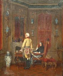 | Keywords: Fritz Werner An officer and a woman in an elegant interior.jpg An officer and a woman in an elegant interior; signed lower left ; inscribed verso; oil on canvas; 55 x 45 cm http //www bonhams com/ by 1908 Fritz Alexander Friedrich Werner 1827-1908 PD-old-100 Fritz Werner People in rooms in art Rococo revival paintings Images from Bonhams 18th-century domestic interiors | ||||